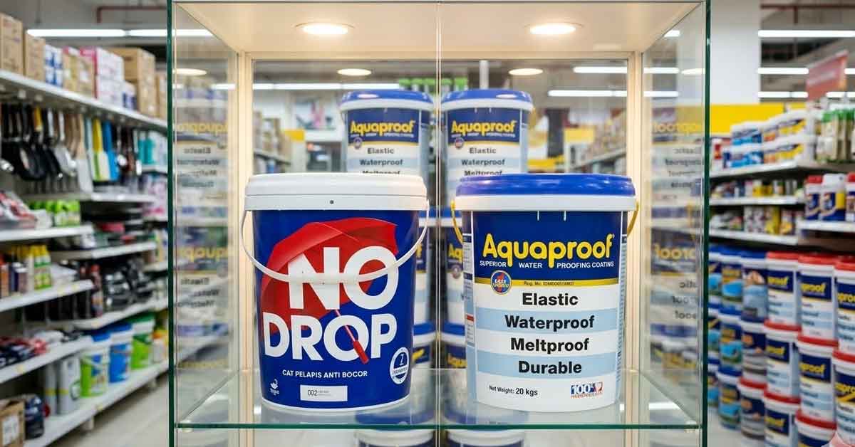 Dalam pekerjaan waterproofing dak beton tanpa bongkar, saya sering menggunakan produk coating yang kualitasnya sudah terbukti di lapangan. Dua di antaranya yang cukup sering digunakan adalah Aquaproof dan NoDrop.
